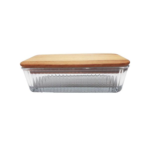 ظرف کره خوری و پنیر خوری بسیار شکیل که شامل بخش زیرین و یک درب چوبی واشر دار میباشد که برای نگهداری آنها در یخچال نیز مناسب می باشد. بخش زیرین این ظرف از جنس شیشه ضخیم و کنگره ای میباشد و درب چوبی آن زیبایی دوچندانی را به آن داده است